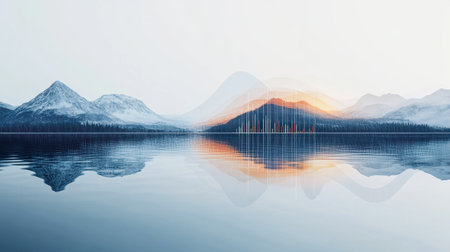 A tranquil lake reflects the soft hues of dawn, with distant mountains creating a peaceful backdrop under a clear sky. The blend compositions elements for a dreamy effect.