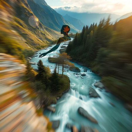 Double exposure portrait with nature elements trees, river, and mountains at golden hour