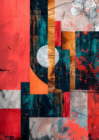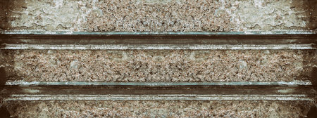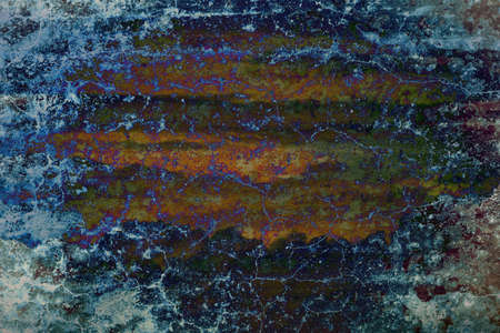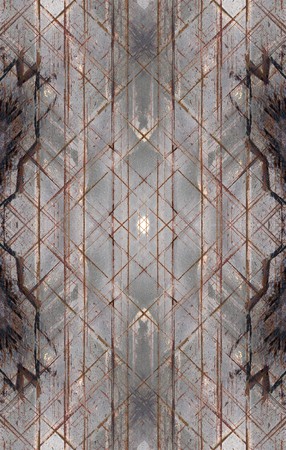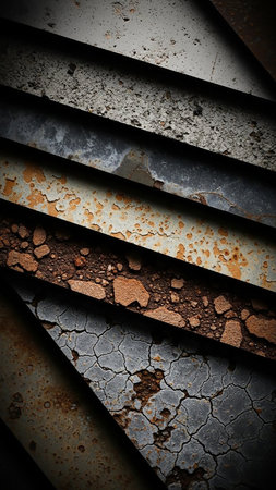 Details showing abstract composition of diagonally arranged weathered and rusted metal and concrete surfaces with cracked textures and peeling paint details...