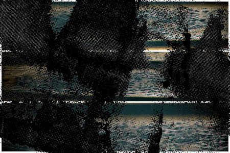 Grunge abstract background featuring a damaged screen with hints of orange contrasting against a blurred landscape