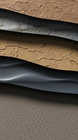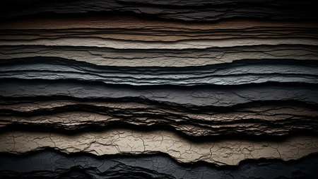 Abstract depiction of geological strata layers with rough, textured surfaces. The layers display a palette of brown, grey, and dark charcoal, resembling a natural...