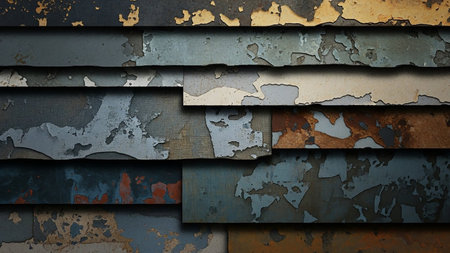 Horizontal slats with layers of peeling paint in shades of blue, gray, and rusty orange create a textured, weathered surface with a distressed appearance.