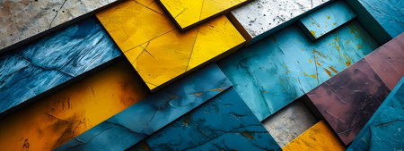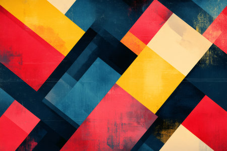 Dynamic abstract pattern with overlapping geometric shapes in red, yellow, and blue creating a modern background