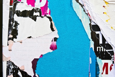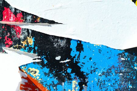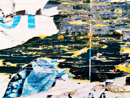 Old grunge ripped torn collage posters creased crumpled paper placard texture background with red, yellow, white, blue colors