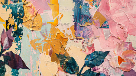 Fashionable background with a collage of torn paper from magazines, variety of patterns. Pastel colors. Generative AI.