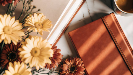 Arrangement of yellow and orange flowers with a notebook in the background