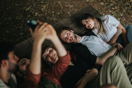 Group of friends taking a selfie together outdoors on a wooden bench