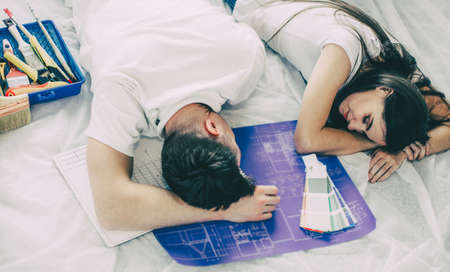 tired young couple is sleeping on the floor in a new apartment.