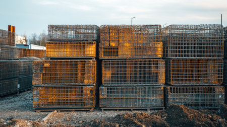 Stacked wire baskets in a construction site create an industrial scene, showcasing organization and materials under warm evening light. Perfect for urban development themes.