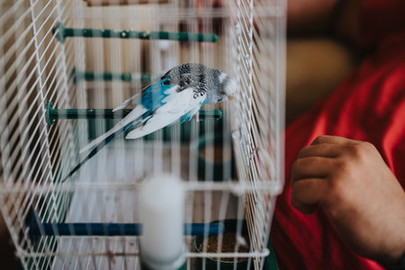 Blue budgie perched inside a birdcage with human interaction