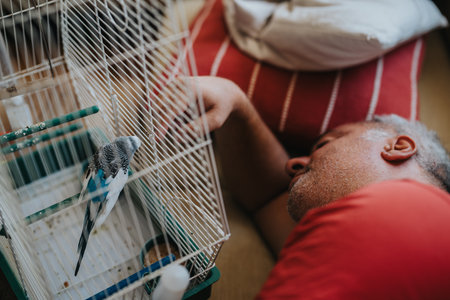 Man resting near a birdcage with a pet bird inside