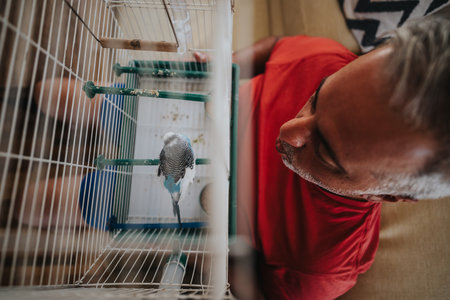 Man observing a budgie bird in a cage from above