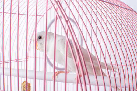 A white budgie sits in a pink cage. High quality photo