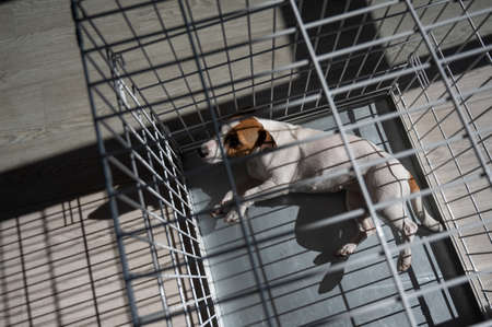 Sad dog Jack Russell Terrier lies in a cage. View from above