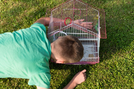A young boy lies on the grass, gently observing a small bird inside its cage. The scene is peaceful, showcasing a connection between a child and their pet.