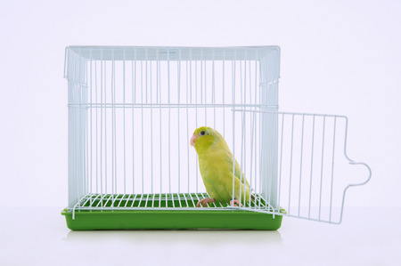 Parrot in bird cage with white background.