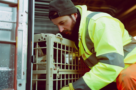Worker in High-Visibility Jacket Checking Dog in Transport Crate.