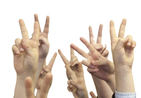 Female hand shows two fingers as symbol of victory. Good feeling and positive emotions of win.