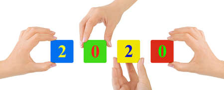 Abstract 2020 & 2019 New year countdown design concept - woman holding wood blocks cubes on wooden table and blue background, close up, copy space.