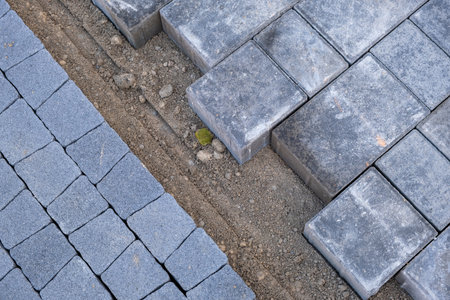 laying of modern beautiful design cobblestones on a flat prepared surface