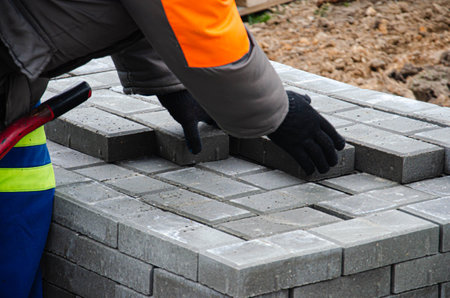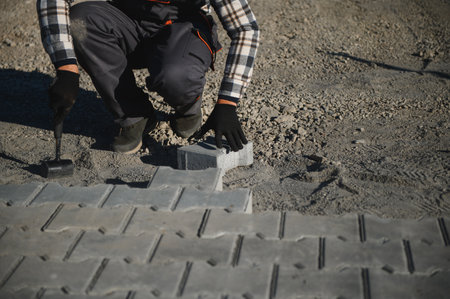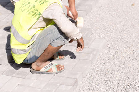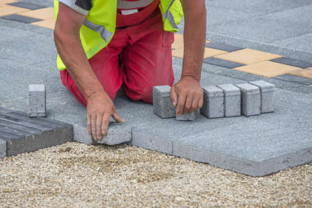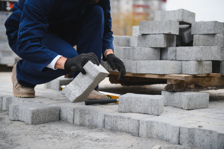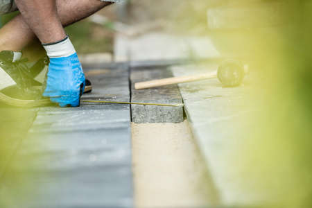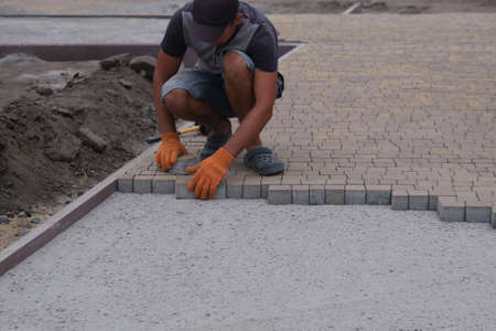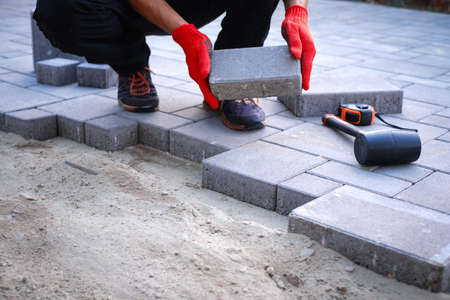 Construction worker installing and laying pavement stones on terrace, road or sidewalk. Worker using stones to build sidewalk