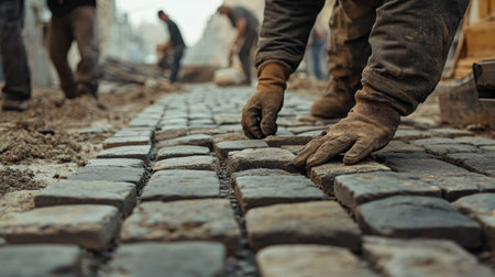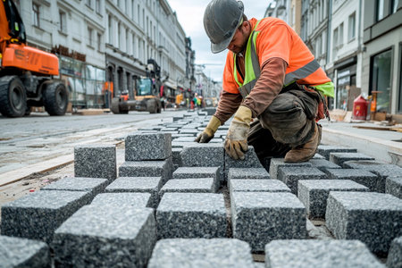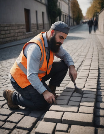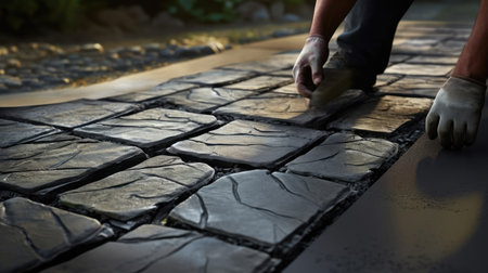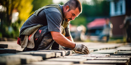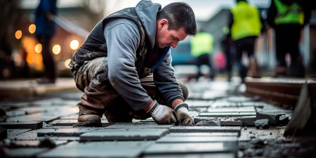worker laying paving slabs, responsible for a beautiful road and path. Generative AI