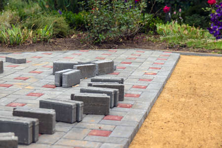 Laying paving slabs on the path, filling with sand. New stone pavement