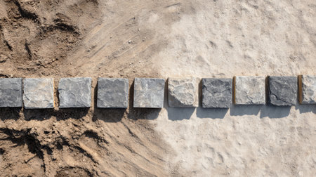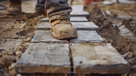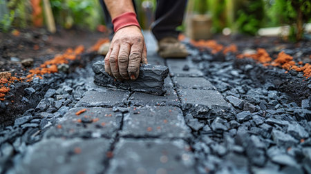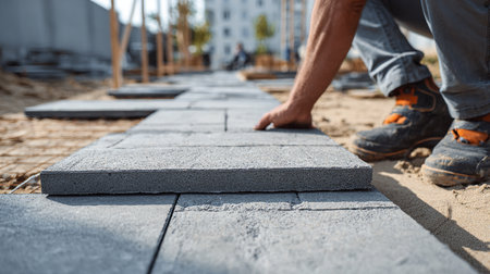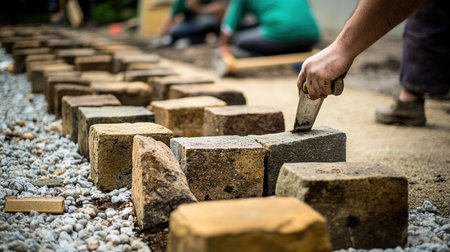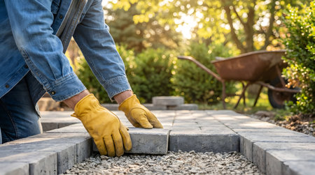 This activity showcases an individual carefully placing concrete pavers onto a gravel base to create a durable outdoor walkway. The setting benefits from ample sunlight, enhancing visibility.