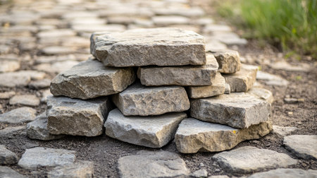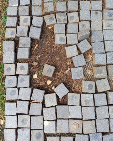 Paving stones on pavement terrace, construction details of cobblestone pavement blocks