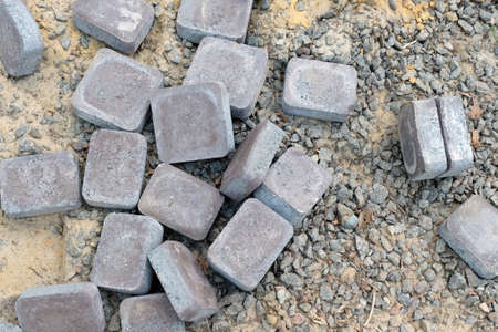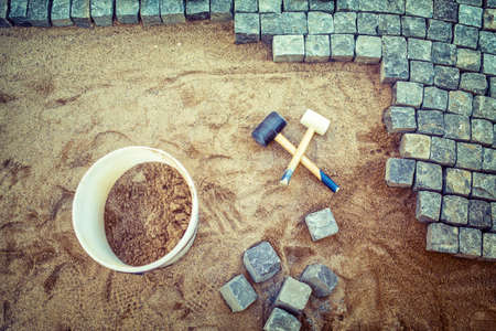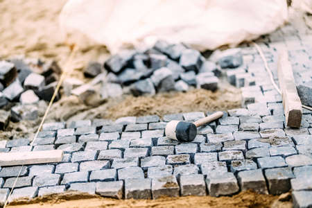 Construction site, tools and details, pavement installing and rocks. Granite stones laying on sand, making of pavement