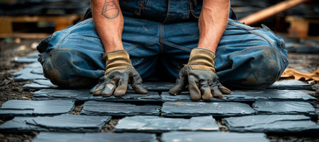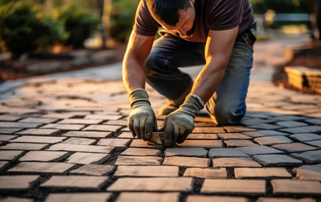 Landscape Worker Laying Paving Stones in a Garden at Sunset. Concept of Outdoor Labor, Construction Precision, Natural Beauty.