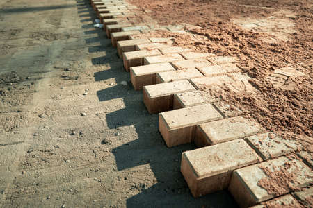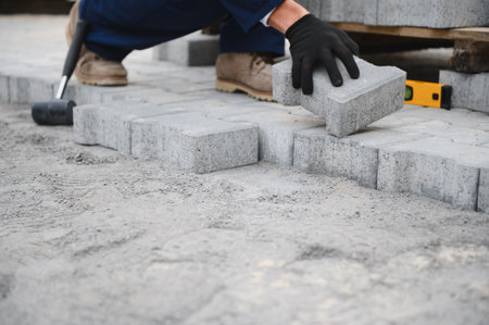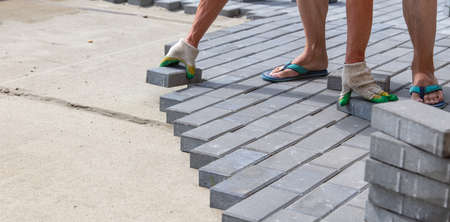 Professional worker layers installing laying gray concrete brick the street in city on leveled sand foundation base