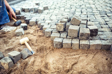 worker laying paving stones. stone pavement, construction worker laying cobblestone rocks on sand.