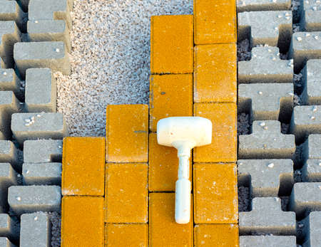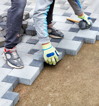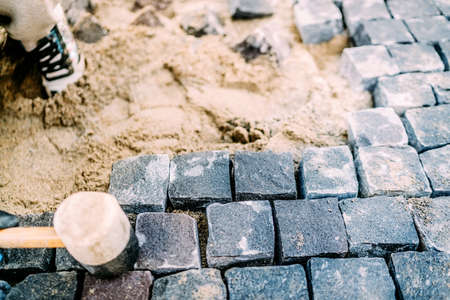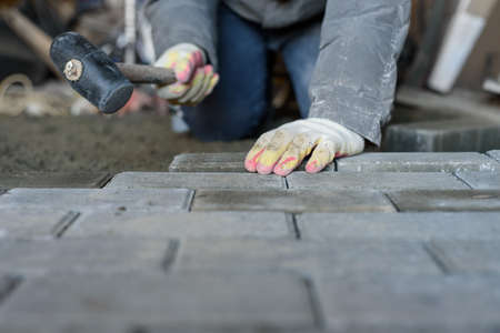 Close-up of construction worker installing and laying pavement stones on terrace, road or sidewalk. Worker using stones and rubber hammer to build stone sidewalk.