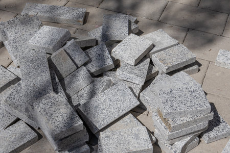 scattered gray pavement tiles, paving slabs, construction of a pedestrian walkway.