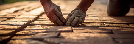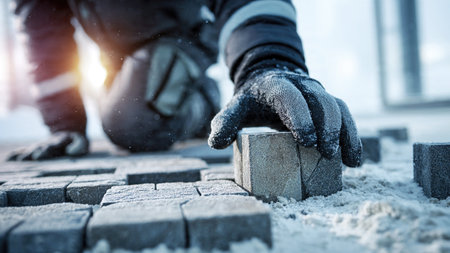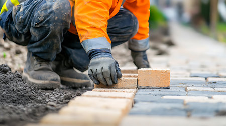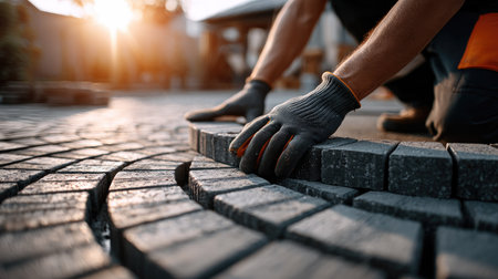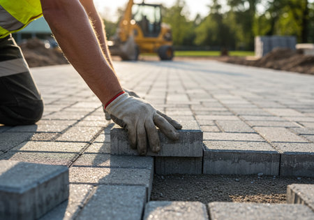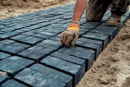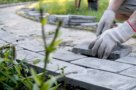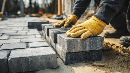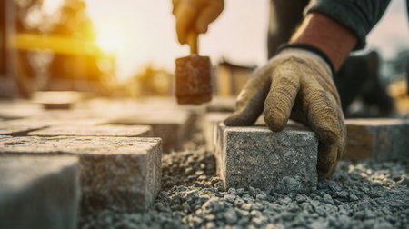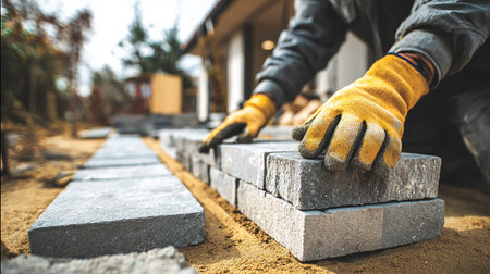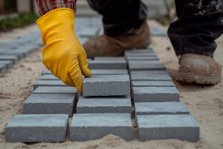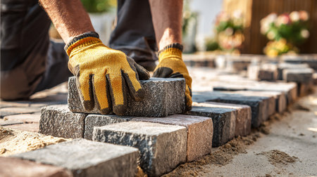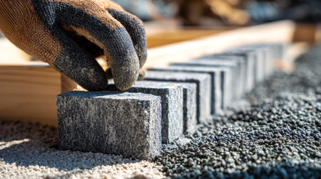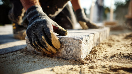 Close up shot showcasing a worker's gloved hand placing a stone paver block into position on a pathway, set in a bed of sand, during landscaping construction.