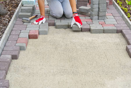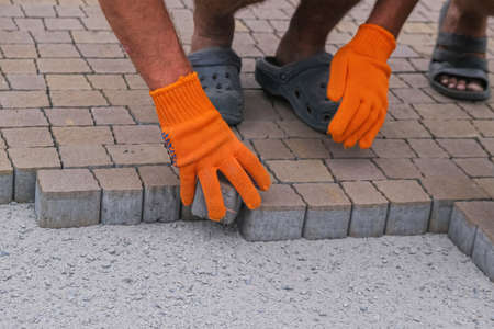 The master in gloves lays paving stones in layers pathway paving by professional paver worker in laying gray concrete bricks