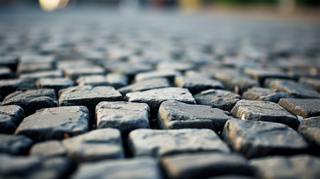 Old Stone Pavement Texture Background, Ancient Granite Cobblestone Road Pattern, Vintage Block Sidewalk Mockup, Paved Roadway Banner with Copy Space for Text, Generative AI Illustration
