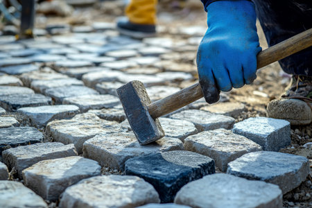Craftsman with blue gloves laying cobblestones on street using hammer and chisel in close up view