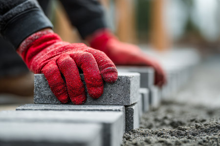A focused craftsman in vibrant red gloves arranges uniform gray blocks, creating an orderly design amid a busy construction zone with new mortar visible behind.