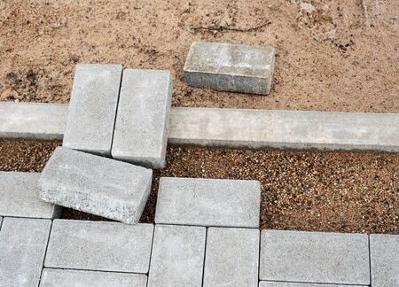 Construction of pavement near the house. Bricklayer places concrete paving stone blocks for building up a Sidewalk pavement