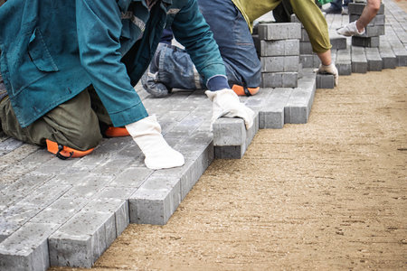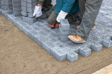 Construction workers installing and arranging precast concrete pavers stone for road at the construction site.
