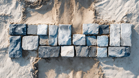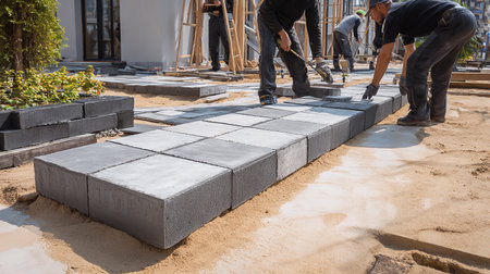 Construction workers are carefully aligning gray bricks on a sandy surface while working on a building project during daylight.