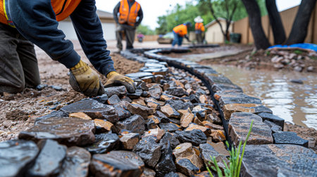 A construction worker wearing yellow gloves carefully places a stone into a dry creek bed. The bed is lined with flat, dark stones, and the worker is creating a curved wall around the edge. The background is out of focus, but shows other workers and a muddy area.
