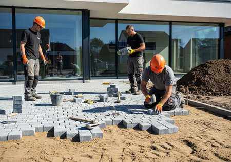 Laying gray concrete paving slabs in house courtyard driveway patio. Professional workers bricklayers are installing new tiles or slabs for driveway, sidewalk or patio on leveled sand foundation base.