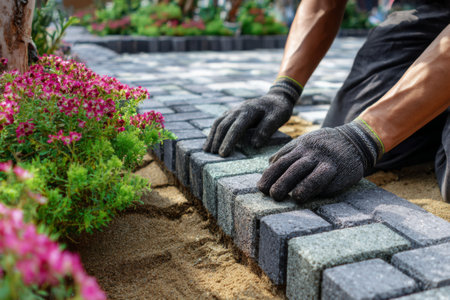 A skilled landscaper carefully lays stones to create a pathway in a garden filled with vibrant flowers and greenery. The focus is on the detailed craftsmanship and natural beauty.
