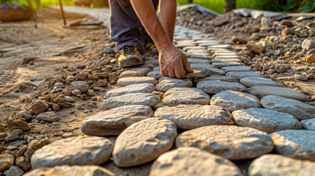 A laborer carefully positions decorative stones over a bed of loose gravel, shaping a stylish outdoor pathway amid a serene landscaping project.