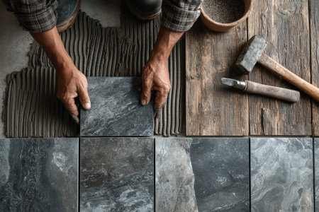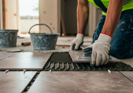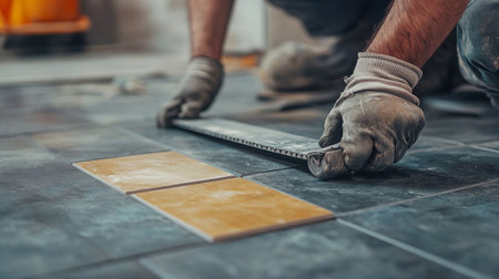 worker carefully laying new tiles, highlighting the precision and attention to detail in the tiling process.Generative AI
