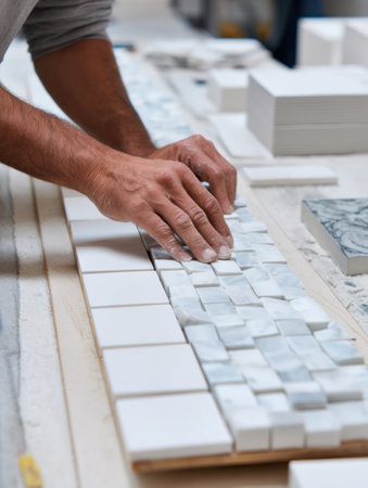 Craftsman carefully positions stone tiles on a surface, highlighting the detailed textures and patterns, surrounded by tools and materials in a contemporary workspace