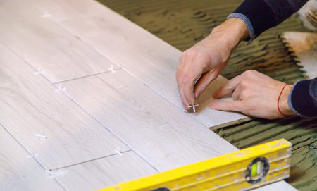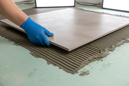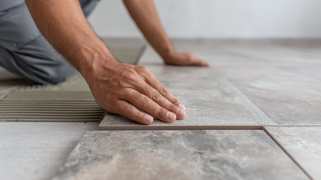 A skilled tiler carefully aligns ceramic tiles on an adhesive surface, showcasing precise craftsmanship in a bright interior, enhancing the beauty of modern living spaces.
